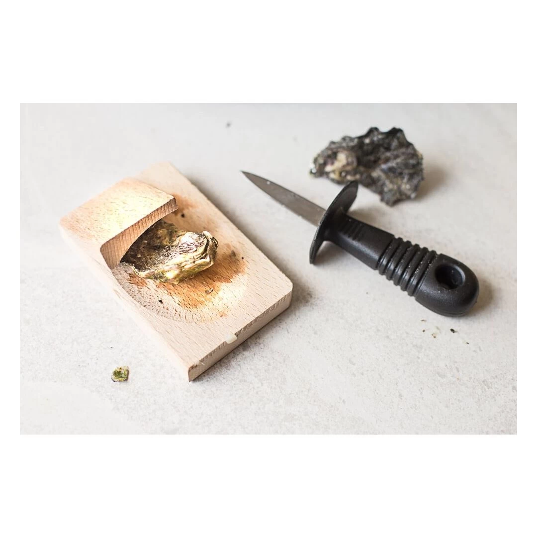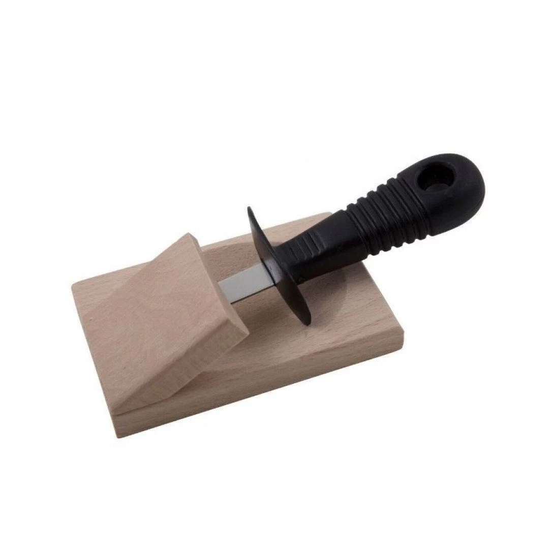 Couteau à huître et cale en bois avec garde-main.