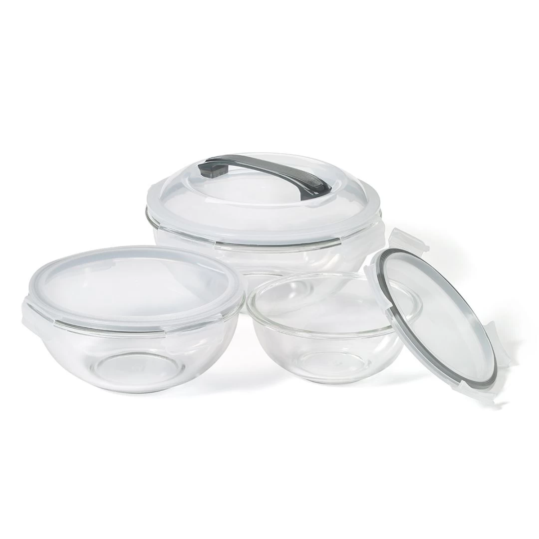 Ces trois bols à mélanger en verre sont équipés d’un couvercle étanche qui sert d’excellent substitut à la pellicule de plastique, couramment utilisée pour recouvrir les bols contenant des aliments ou des préparations destinés à être consommés ou utilisés plus tard. Il n’y a donc ni fuites, ni déversements, ni perte de fraîcheur.