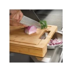 Cette ingénieuse planche à découper a pour avantage de réduire le nombre de mouvements effectués par les cuisiniers et d’en faire une suite plus fluide. La planche demeure toujours en place étant donné la présence des bols en acier inoxydable à ses extrémités, sous les trous qui servent de poignées et de zone de réception pour les aliments.